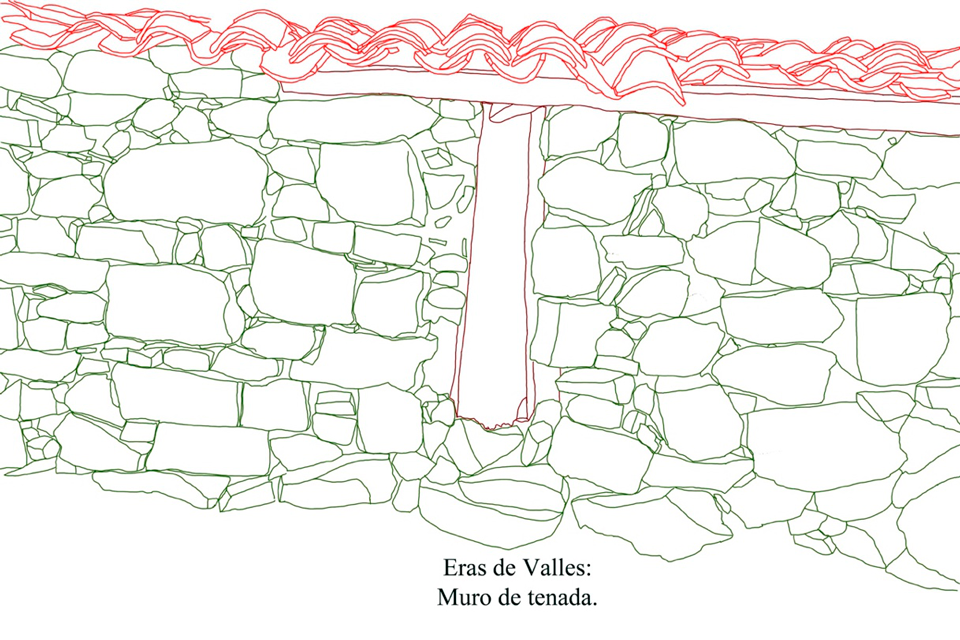Fig. 260.- Dibujo sobre fotografía del muro este de la tenada nº 3 de las “eras de valles” (F. Palomero).