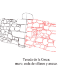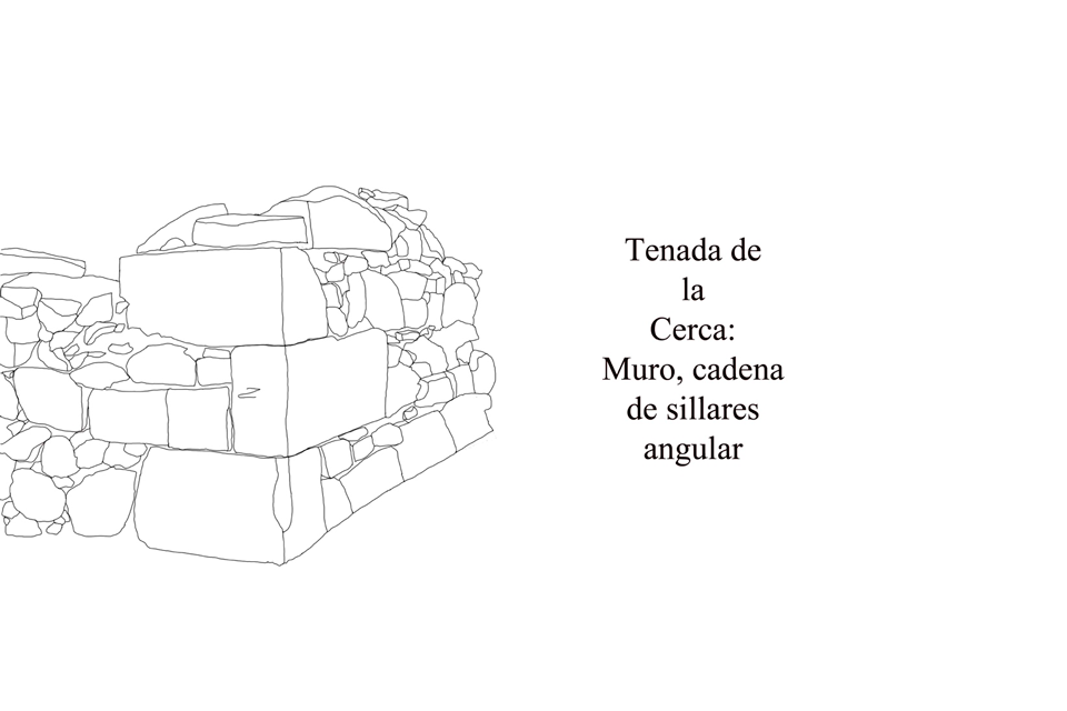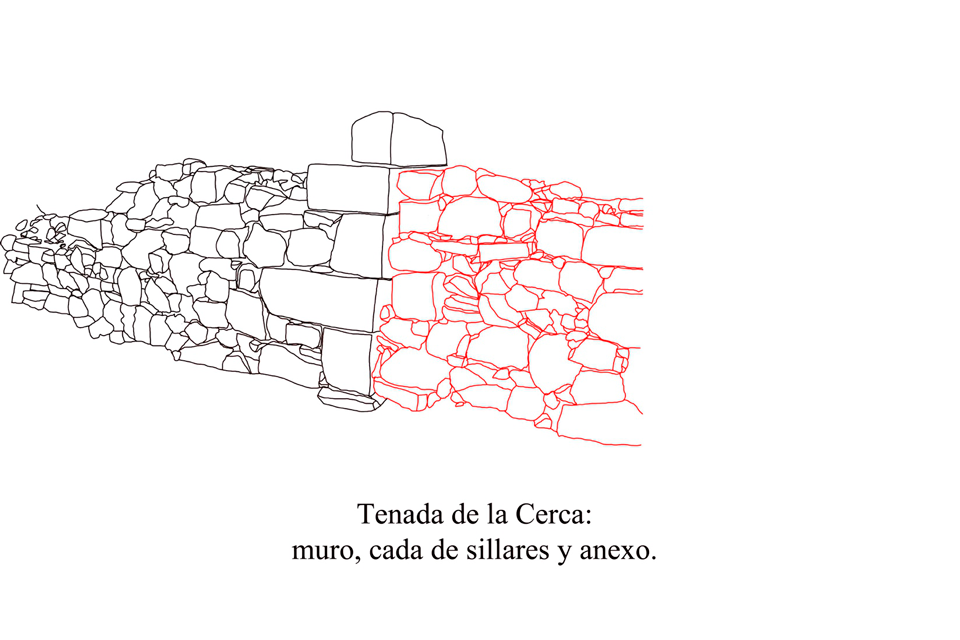 Fig. 262.- Dibujo sobre fotografía del muro, cadena de sillares y anexo de la tenada de la “cerca” (F. Palomero).