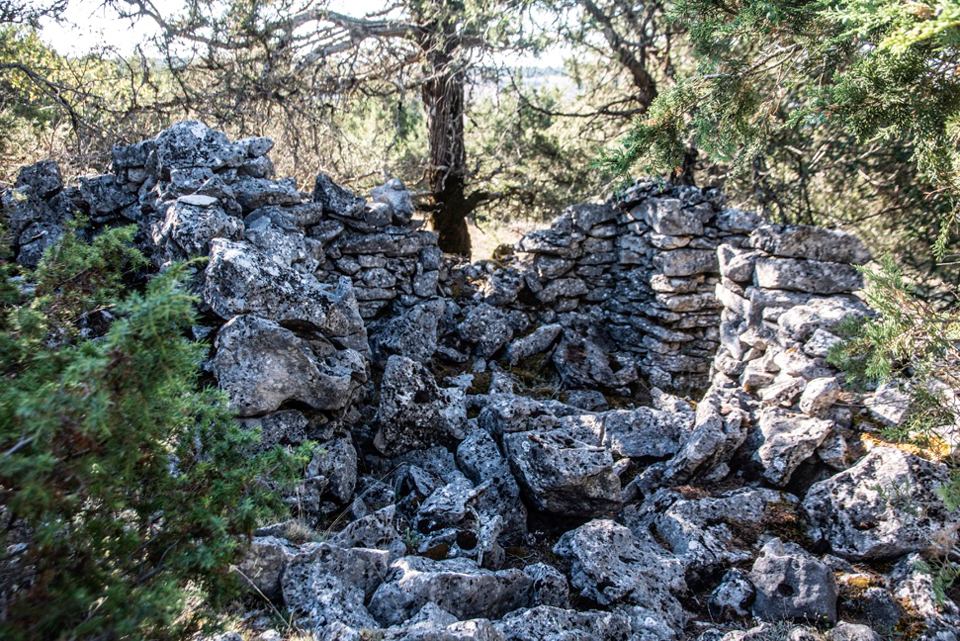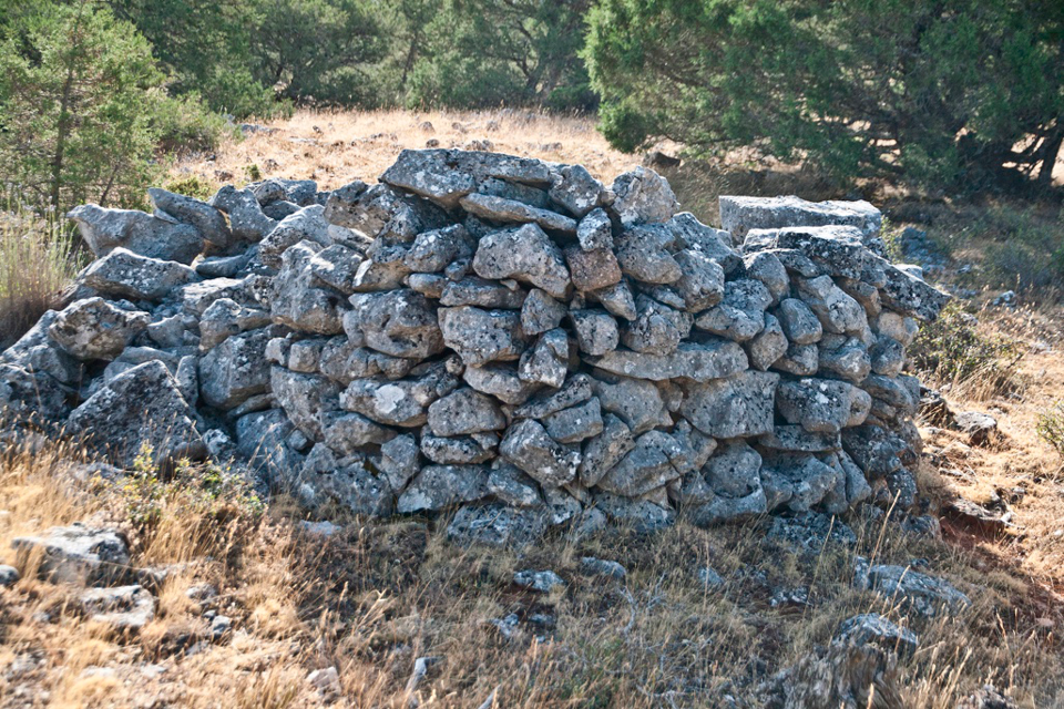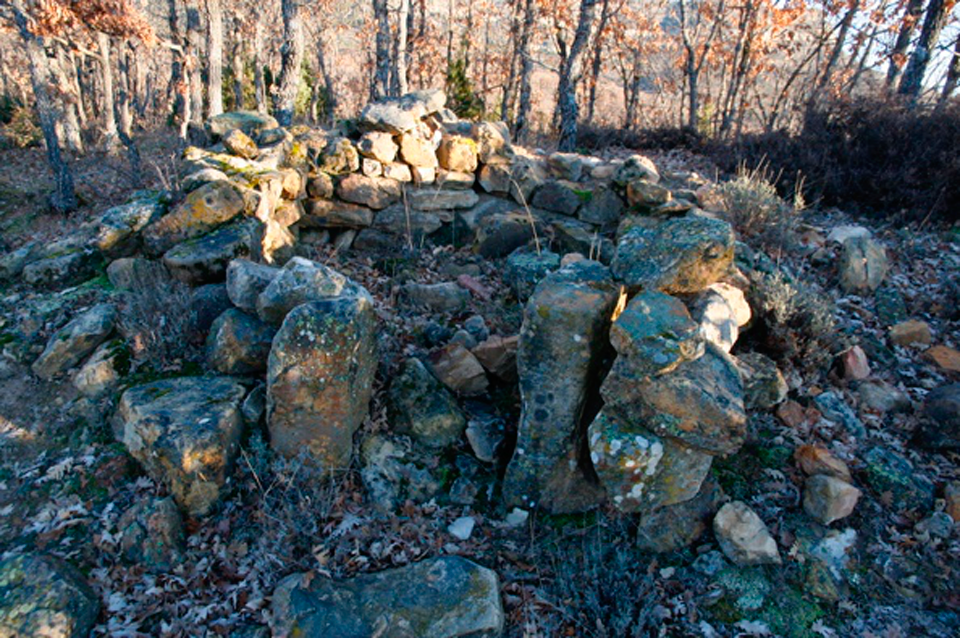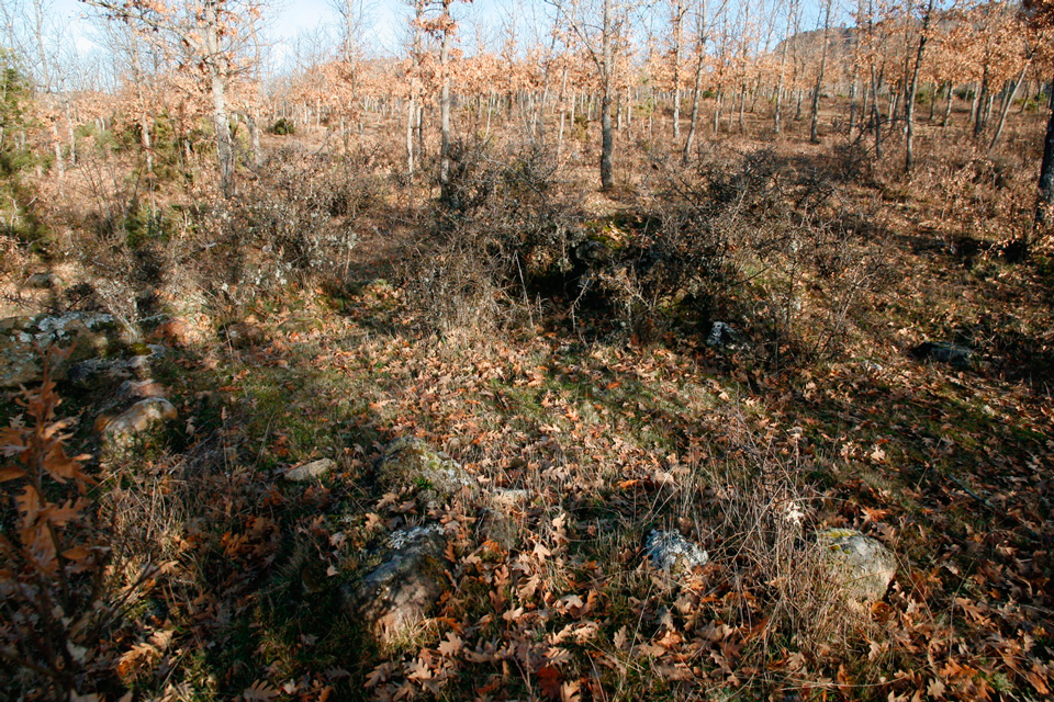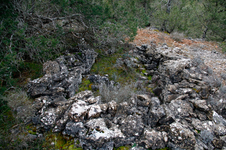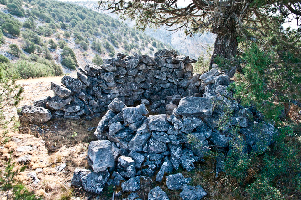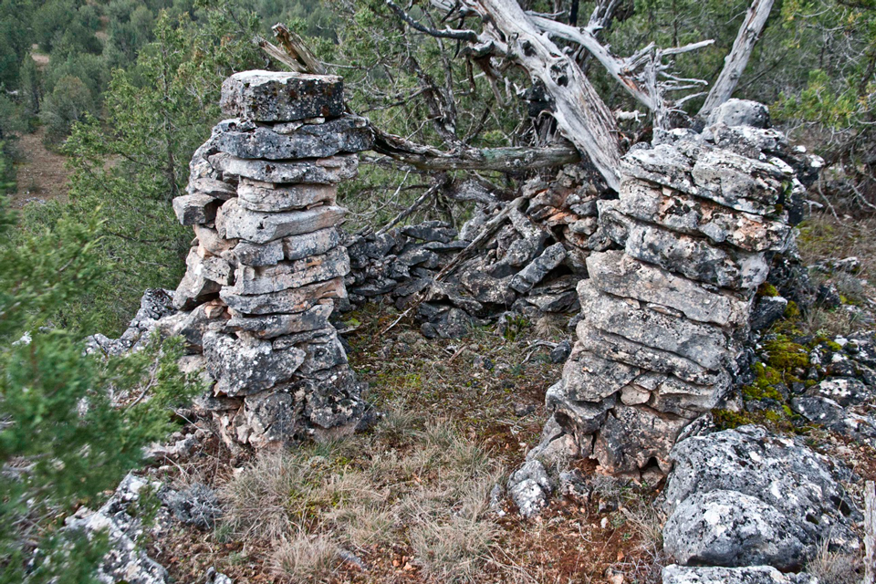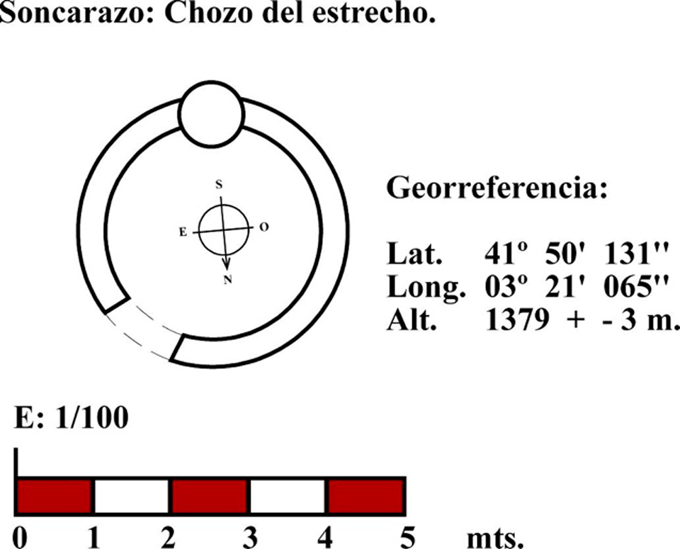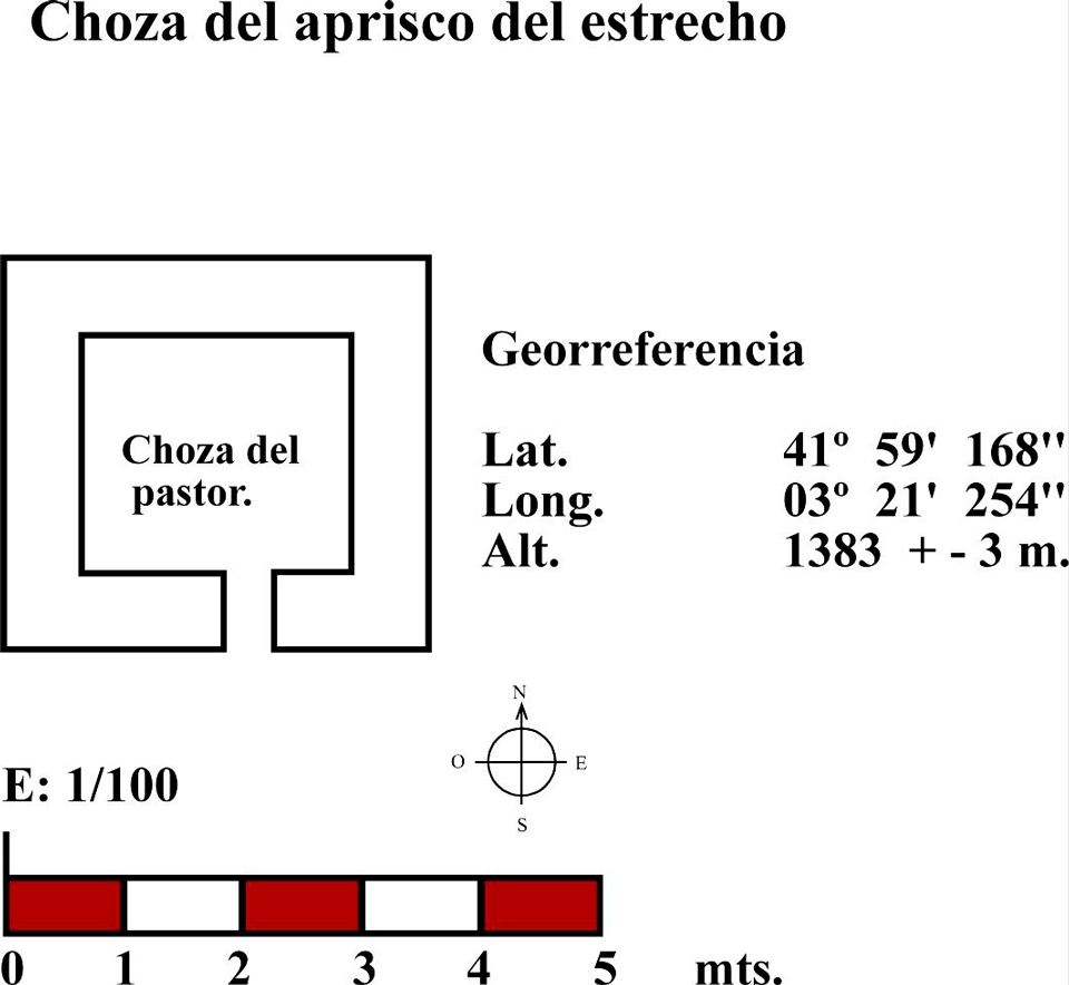 Este chozo o choza se ubica entre árboles, cercana a uno de los apriscos, el segundo, situados en “el estrecho”. Si subimos desde “el chorro” por el camino abierto por los montañeros está muy próxima al mismo una vez superada la subida y llegados a la zona llana. El muro está realizado con piedra caliza, lajas de diferente tamaño colocadas a hueso formando paramento de mampostería (fig. 87) y con un grosor cercano a los 60 cms. Presenta una planta próxima al círculo, abre la puerta hacia el noreste (fig. 88) y en parte los muros se apean en el tronco de una gruesa sabina. Aún podemos ver varias vigas o troncos de sabinos que debieron formar parte del entramado de la cubierta (fig. 87). Suponemos que el entramado, además de las vigas debió tener ramas y bálago sobre la que muy probablemente hubo lajas calizas colocadas en forma imbricada.