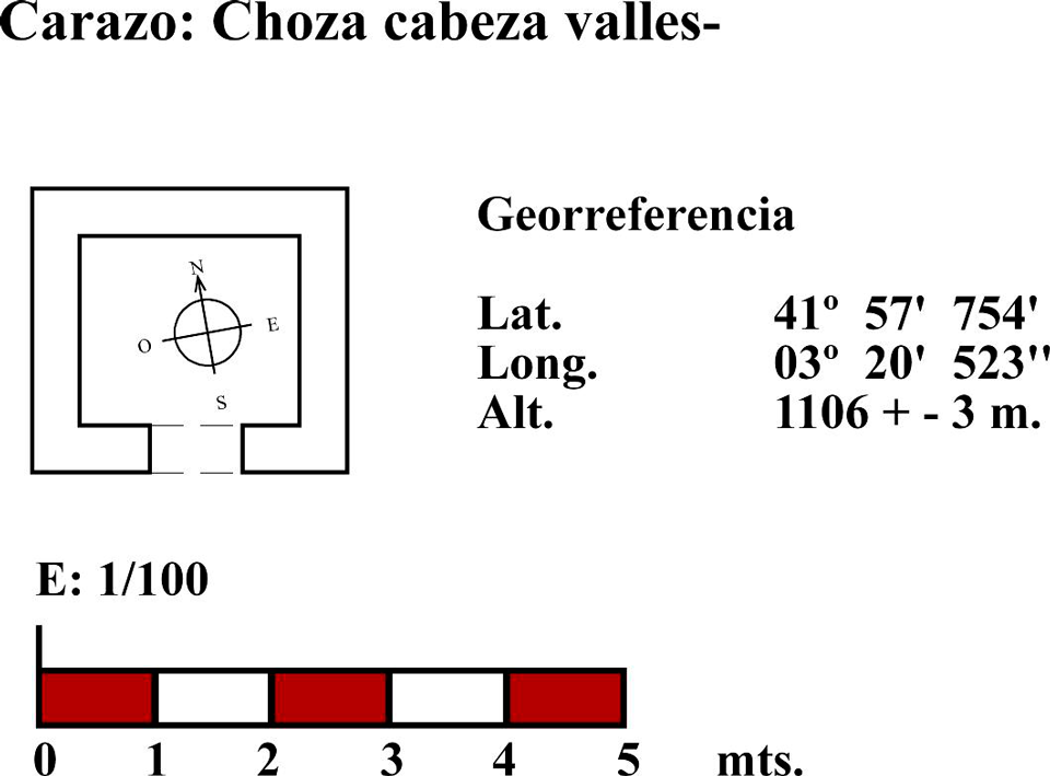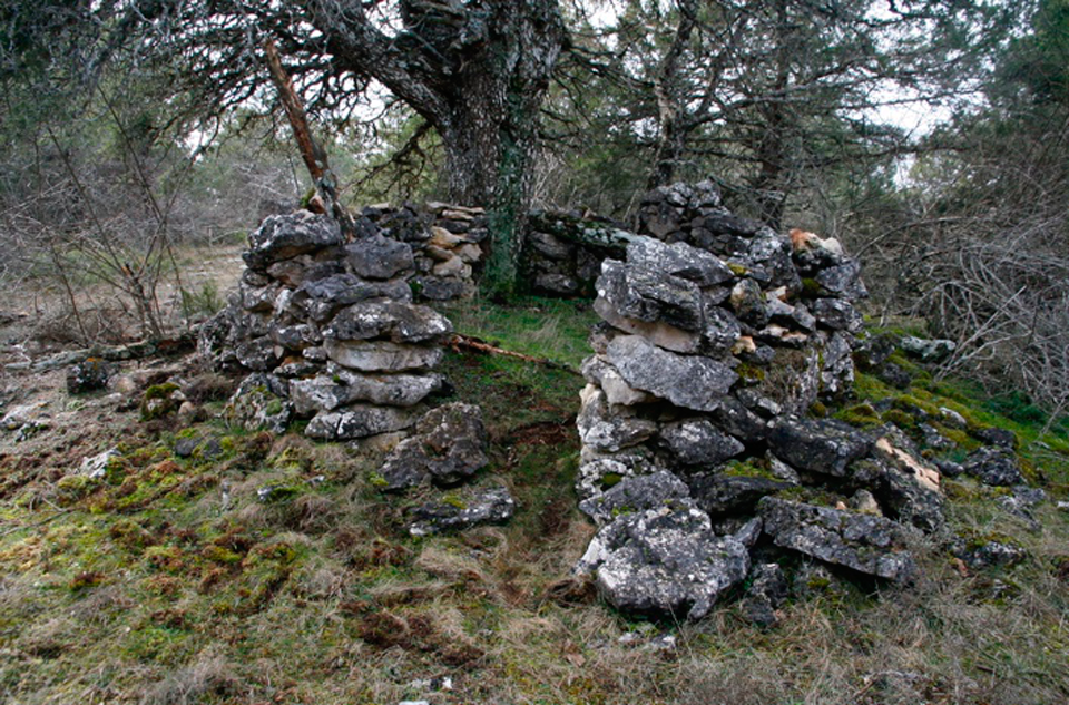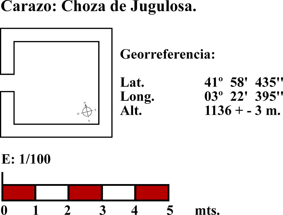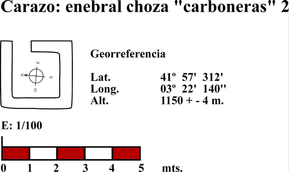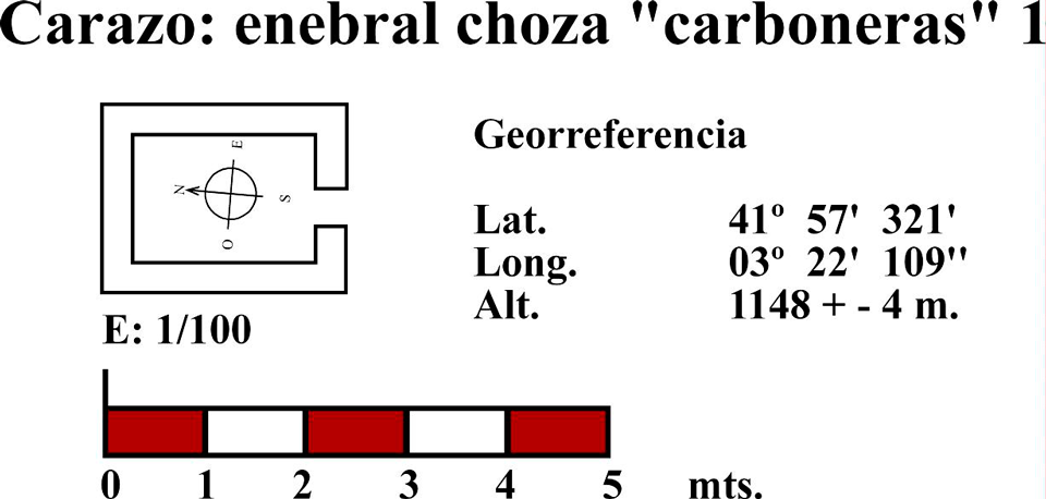 Esta choza está situada en el borde de un imponente cantil en el paraje conocido como “las carboneras”, en el monte del enebral desde donde se controla un amplio terreno. En planta se aproxima a un cuadrángulo (fig. 77 y 78), tiene muros de piedra caliza, aparejo de mampostería (fig. 77), portada abierta hacia el noreste (fig. 77 y 78) y cubierta que tuvo en entramado de madera del que aún se conservan algunos cabríos (fig. 77). Una parte del muro está adosada a una sabina que ha ejercido la función de apeo de una parte del muro. Parece que la cubierta se conformó con un entramado de madera, vigas de sabina, con ramas y sobre ellas algún bálago completándolo con lajas de piedra caliza a la manera de los tejados, colocadas de forma imbricada como las escamas de pez.