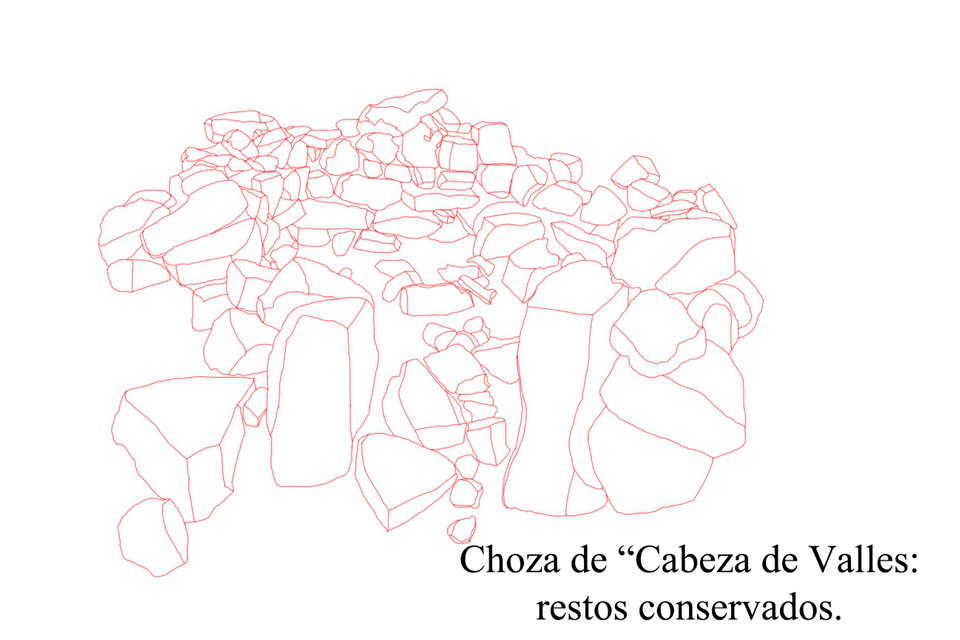 De esta choza únicamente hemos podido documentar el lugar donde estuvo ubicada, levantar la planta y conocer que los muros fueron de piedra arenisca. Únicamente queda en pie parte del arranque de los muros (fig. 75). Por lo inventariado hemos podido reconstruir una planta cercana al cuadrado con portada abierta al sur (fig.76).
