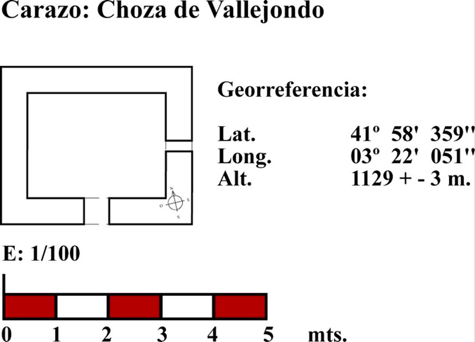 Esta construcción, ubicada en la zona bajera de “vallejondo”, presenta muros de mampostería con cadenas de sillares angulares y cuidadas jambas tanto en la portada abierta al mediodía como en el pequeño vano situado en el muro este (fig.73). La cubierta es a dos aguas. La planta se aproxima al rectángulo (fig. 74) y la construcción que vemos en la actualidad ha sufrido una importante restauración hace algo más ocho años. Es la única que se conserva en uso de todas las existentes en este término municipal.