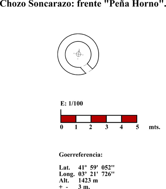 Esta choza está situada en una zona bastante accidentada, muy próxima a “Peña del Horno”, en la vertiente norte, ya cercana a la cumbre de la citada roca. La planta que presenta se aproxima al círculo (fig. 81), los muros son de piedra caliza, de aparejo de mampostería colocada a hueso y puerta abierta hacia el sudeste (fig. 82). No conservamos nada de la cubierta pero muy probablemente tuviera un entramado de ramas con lajas de piedra caliza colocadas a la manera de las escamas de un pez.