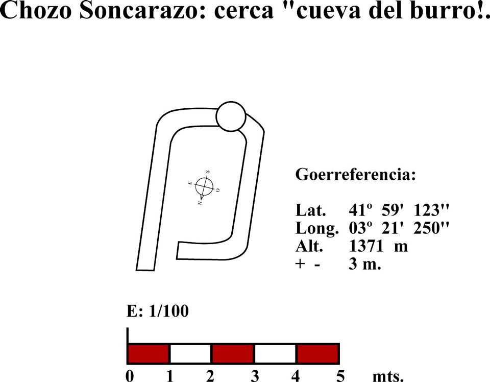 Este chozo o choza se sitúa próxima al desnivel que bajo hacia lo que se conoce como “cueva del burro” (fig. 86). El muro está realizado con piedra caliza, lajas de diferente tamaño colocadas a hueso formando paramento de mampostería (fig. 85). Presenta una planta rectangular con un lado, el meridional, ligeramente ondulado que se adosa el tronco de una sabina (fig. 85). Los muros presentan un grosor de algo más de 50 cms. En la actualidad no hay indicio alguno del tipo de cubierta que pudo tener. Suponemos que fuera un entramado de madera de sabina con ramas y bálago pues no hay restos de teja por ninguna parte (fig. 85). No sería de extrañar que las tejas se reemplazaran por losas calizas colocadas de forma imbricada, a la manera de las escamas de pez. Entendemos que esa pudo ser la cubierta de la mayor parte de las chozas o chozos tanto del enebral como de Soncarazo.