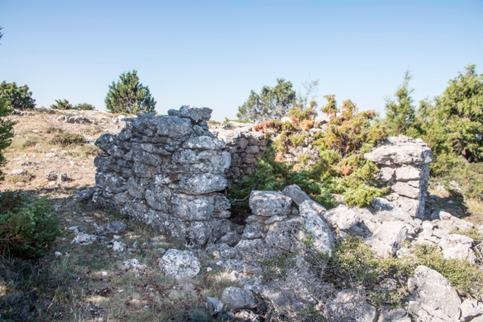 Esta choza está muy próxima a la precedente, cercana al acantilado y guardando el paso que da acceso a esta parte del momento. Por los restos que hemos podido documentar (fig. 79) sabemos que la planta se aproximaba al cuadrángulo (fig. 80), los muros eran de piedra caliza con aparejo de mampostería y colocados a hueso (fig. 79). La puerta se abría al mediodía y la cubierta bien pudo tener un entramado de madera con ramaje o bálago y lajas de piedra colocadas a la manera de las escamas de pez.