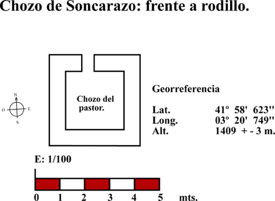 Este chozo o choza se ubica en una zona próxima al “rodillo” y sin apenas arbolado. El muro está realizado con piedra caliza, lajas de diferente tamaño colocadas a hueso formando paramento de mampostería (fig. 89). Presenta una planta rectangular, puerta abierta hacia el norte (fig. 90) y muros con un grosor de algo más de 50 cms. En la actualidad no hay indicio alguno del tipo de cubierta que pudo tener. Suponemos que fuera un entramado de madera de sabina con ramas y bálago pues no hay restos de teja por ninguna parte. No sería de extrañar que las tejas se reemplazaran por losas calizas colocadas de forma imbricada, a la manera de las escamas de pez. Entendemos que esa pudo ser la cubierta de la mayor parte de las chozas o chozos tanto del enebral como de Soncarazo.